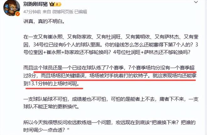 別跑剛背豬雖然不點名張昊嘉,但是他說的場均不到8分,場均打13.1分鐘,正好是張昊嘉的數據。當比賽出現到張昊嘉空籃不中時,別跑剛背豬怒斥了:張皓嘉,你給我死下去!也就是說你不要再打了,給我下去。可是杜鋒迷蠻他啊,有什么辦法。這場球被張昊嘉和耍英雄的胡明軒坑慘。球迷也說,如果杜鋒不知換誰下,那就是換下和縮少張昊嘉的時間。張昊嘉這表現,不知諸位如何評價,你們說說吧。